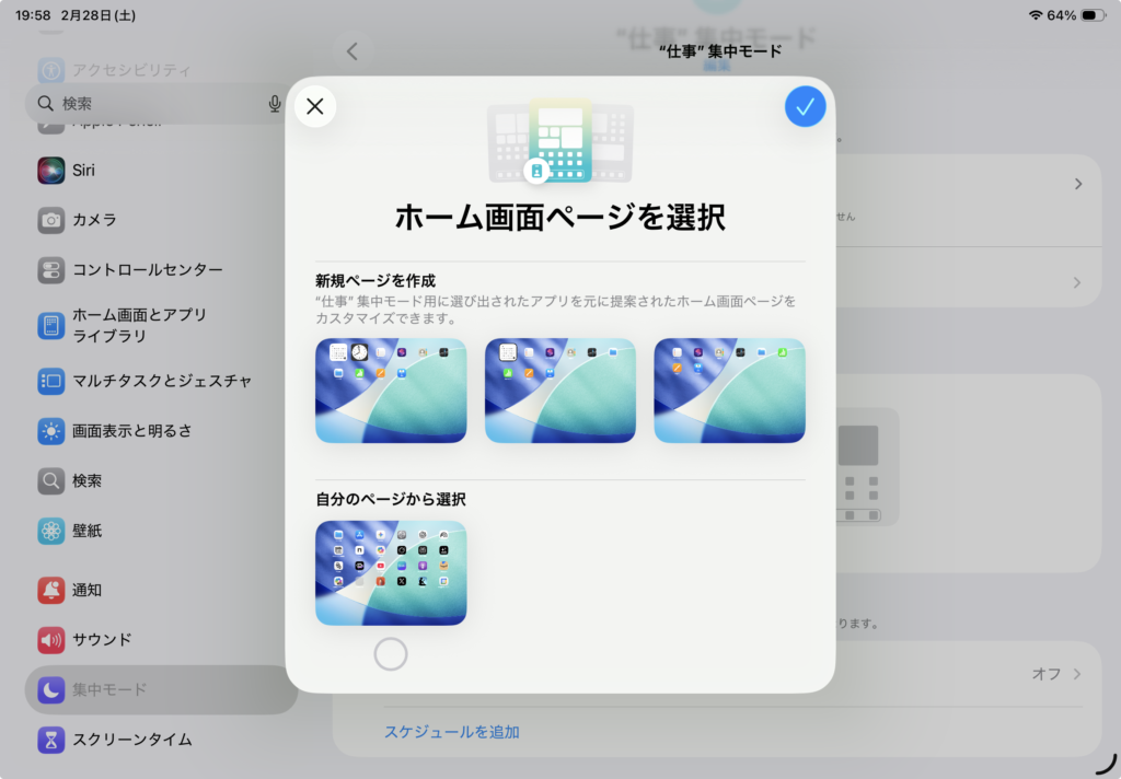 この画面から集中モード中に表示したいホーム画面を選択しましょう。
