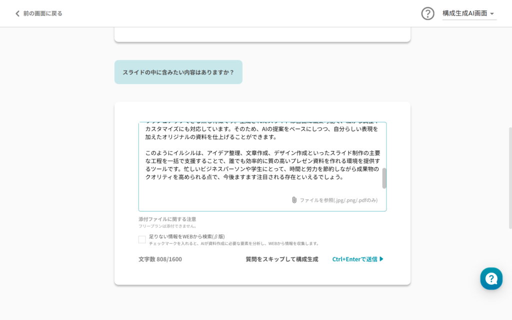 なので以下のようにテキストで含んでほしい内容を指示するか、ファイルを添付して、AIにスライドの内容を覚えさせましょう。