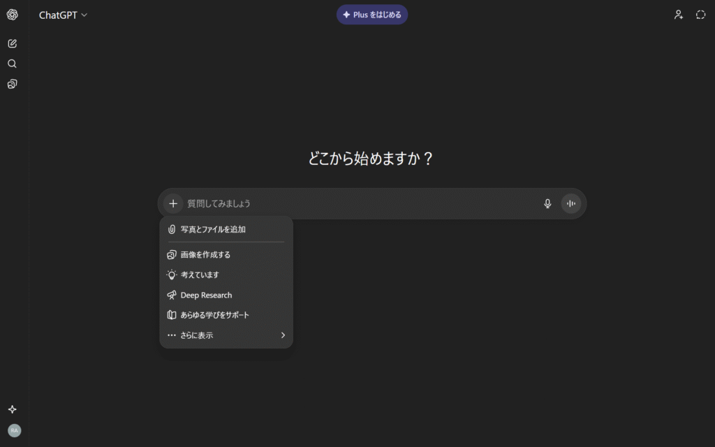 ChatGPTを開きチャットボックスの左にある「+」を押すとこのようにたくさんの機能を使うことができます。まずは、考えています(Thinking機能)についてみていこう。