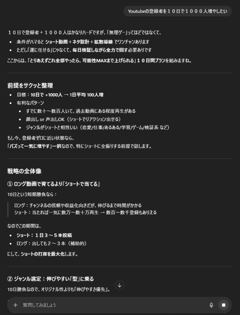 このようにthinking機能を使ったチャットだと通常のチャットよりもさらに詳しく、具体的な案を提示してくれます。