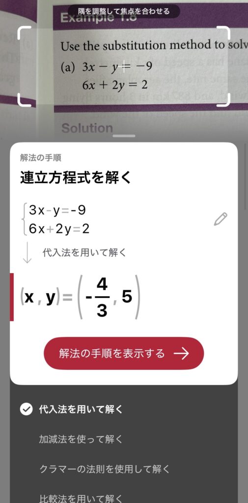 このように写真を撮影するだけで答えおよび複数の解き方が表示されます。