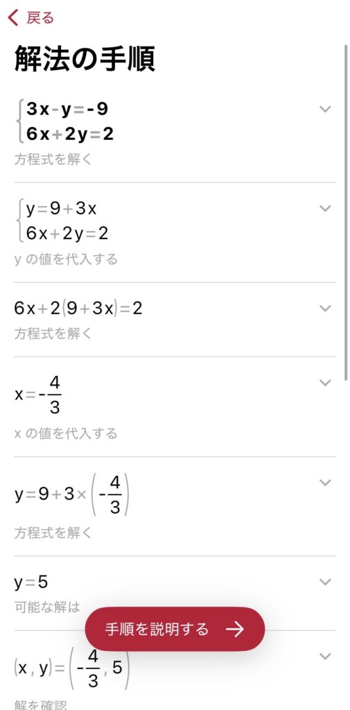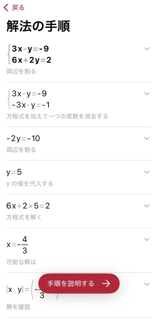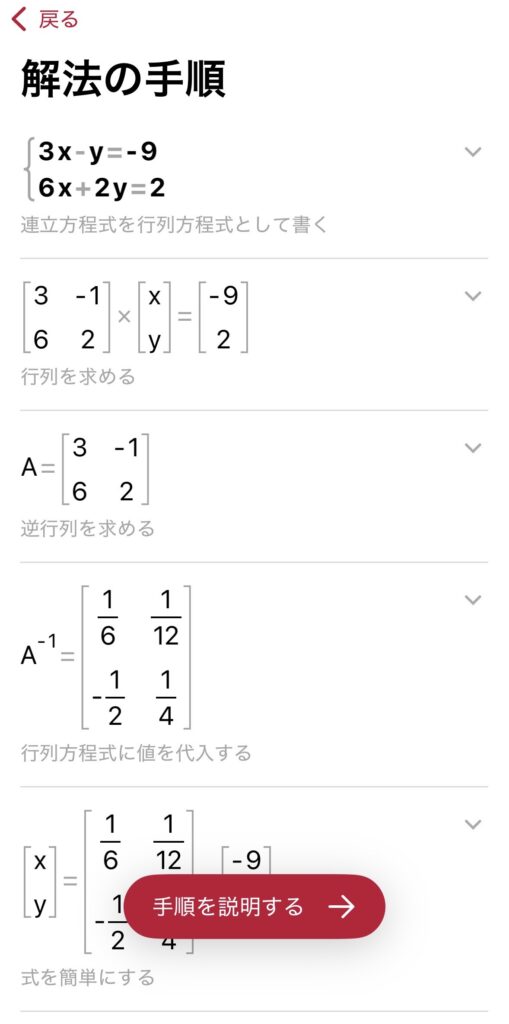 そして「解法の手順を表示する」という赤いボタンを押すと上記のように様々な解法での解き方を提示してくれます。(左から代入法・加減法・行列)