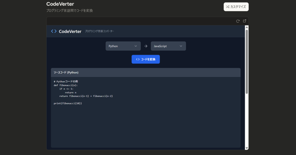 CodeVerterではあらゆるプログラミング言語を変換することができます。例えばPythonからJavaScriptへ変換などです。