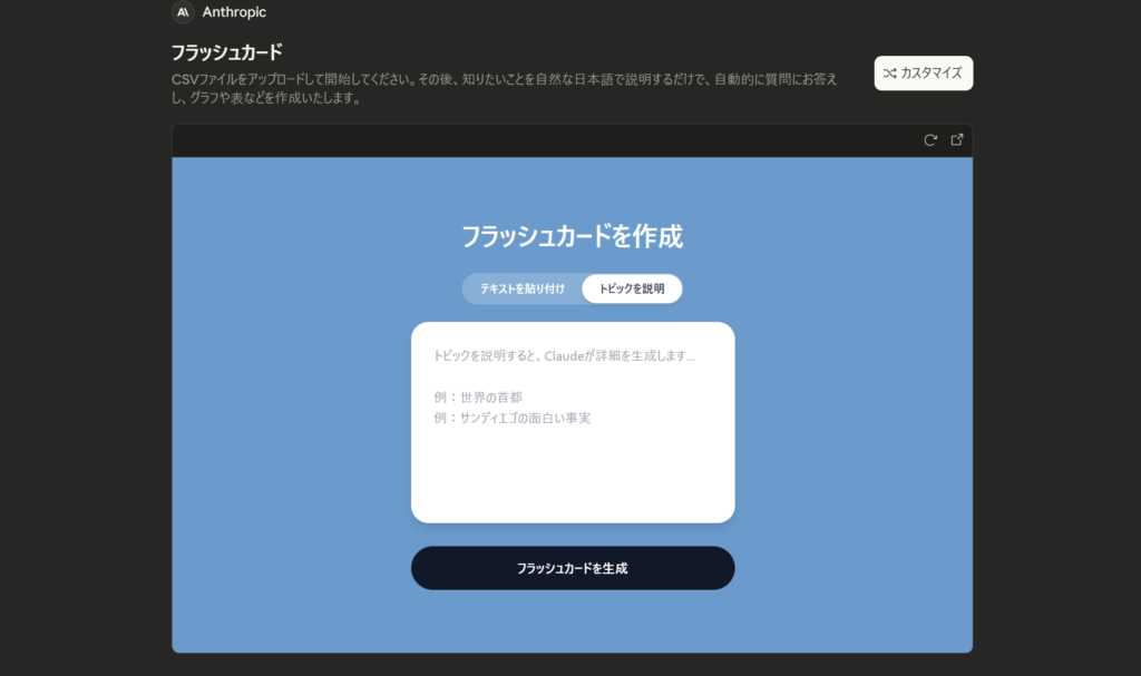 このフラッシュカードでは、自身のテキストを張り付けするかトピックを選択するかによってカードを作ることができます。