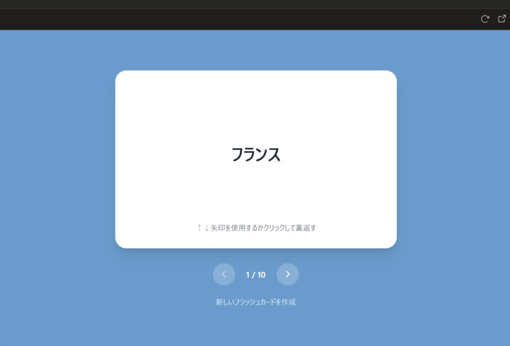 試しに「世界の首都」をトピックにしてフラッシュカードを作ってもらうと、このようなフラッシュカードができます。