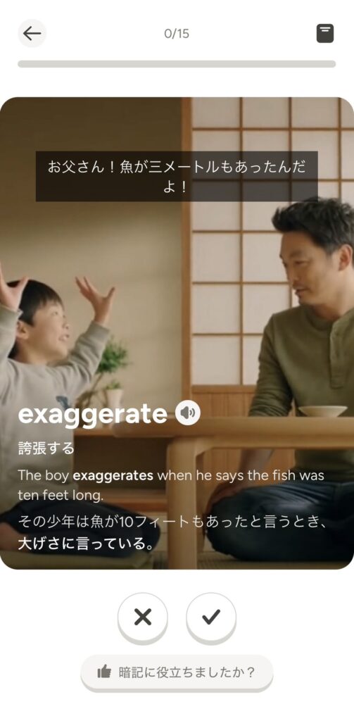 Quikでは、英単語と一緒に英文が表示され、さらにその英単語を表すショート動画が流れる仕組みになっています。