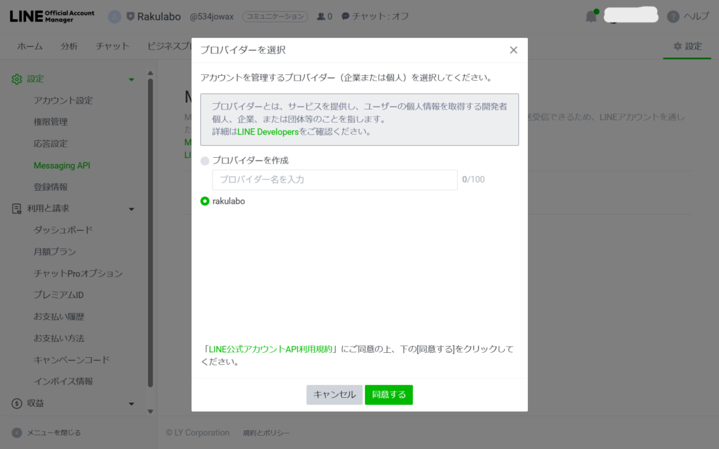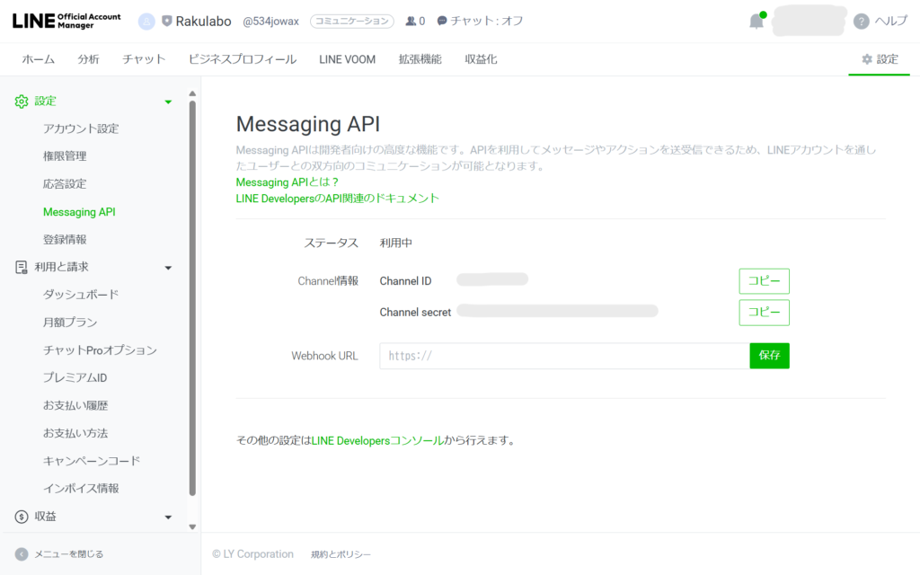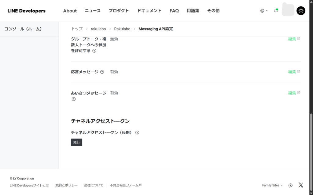 ⑬アカウント選択後にMassaging API設定を開き、チャンネルアクセストークンを発行しましょう。