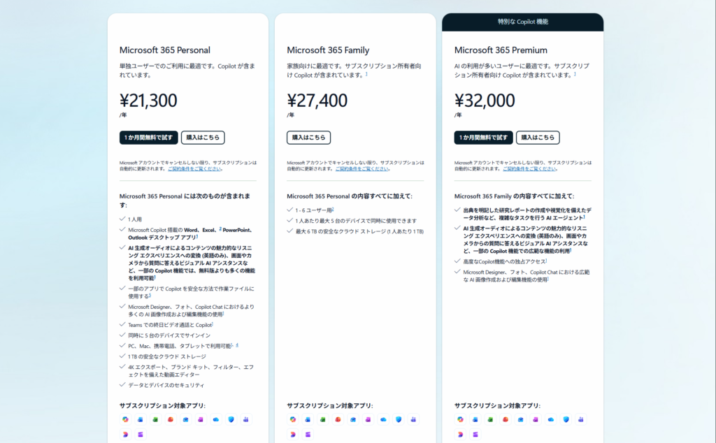 Copilotの個人向けプランでは、このように3つのプランが用意されています。