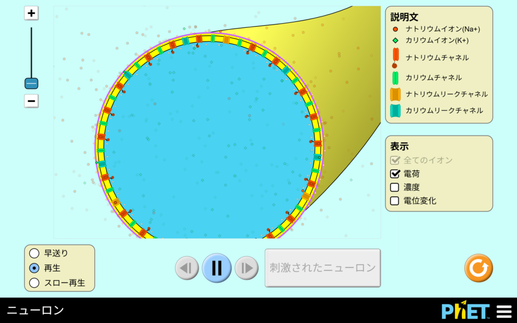 この機能では任意のタイミングでニューロンに刺激を伝達させることができ、それに伴った膜電位・イオン濃度などの動きを観察することができます。