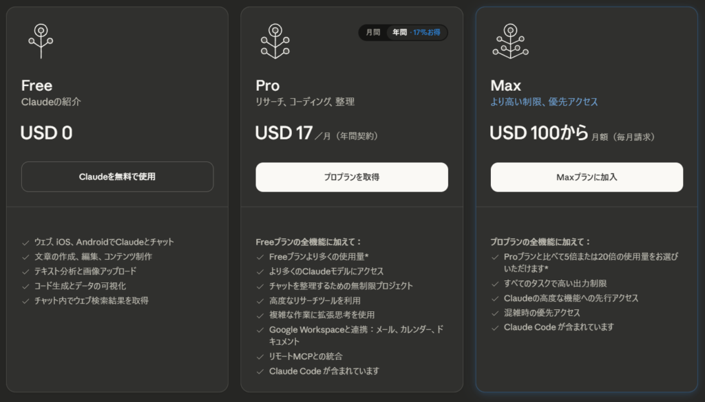 料金は以上のようになっており、Pro版は他の有料AIと比べても比較的手ごろな価格になっています。Claude Codeも使えるようになるので、余裕のある方は試してみることをお勧めします。