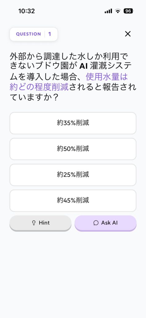 シンプルで見やすいデザインですよね。Turboのよいところはこのような問題を解いている間に広告が一切出ないことなんです。Quizletなどの大手サービス会社も広告を出してくるので、この点はTurboが非常に魅力的です。