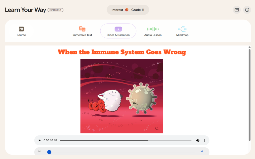 • 没入型テキスト (Immersive text): 単なるテキストではなく、内容を補足する生成画像や理解度を問う質問が埋め込まれており、受動的な読書を能動的な学習体験へと変えます。