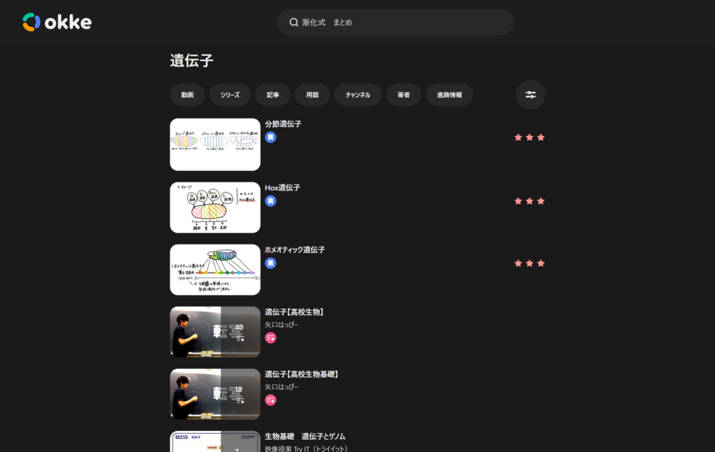 まず、Okkeではブラウザ内での検索バーに調べたい単元のキーワードを入れることで、YouTube上の様々な教育コンテンツを視聴することができます。