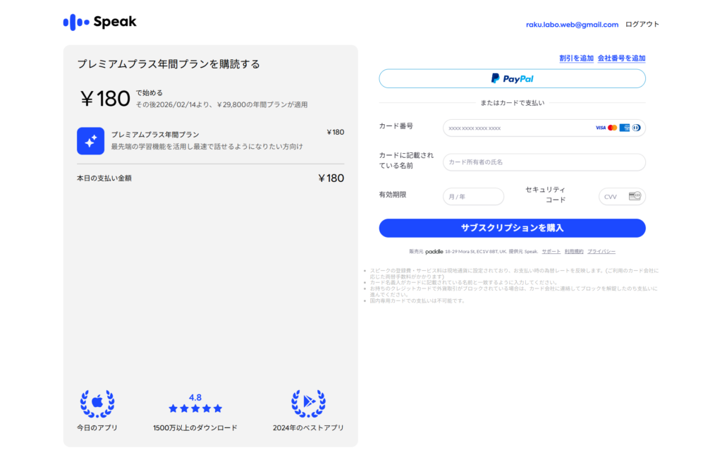 ①以下のリンクからSpeakをダウンロード後月180円で体験を選択